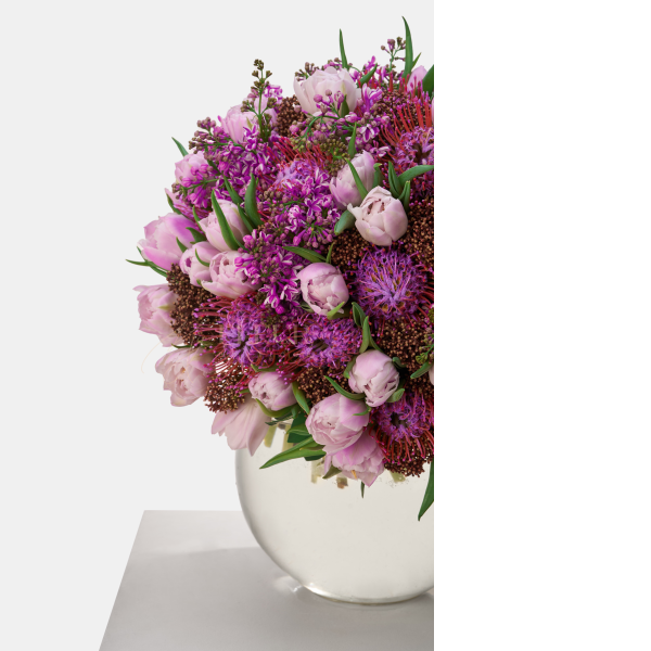 This violet-hued arrangement reveals a delicate symphony, where enchanting fragrances intertwine with elegant charm, forming a botanical masterpiece. Unique forms add an exotic touch to this composition, while subtle greenery intertwines to complete the tranquil ensemble. A calming blend of soft colors captures the essence of nature's harmony, evoking a sense of blissful tranquility and refined beauty.