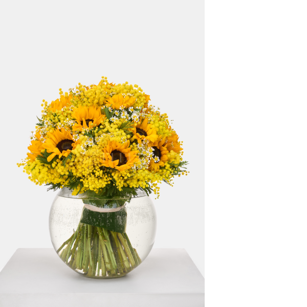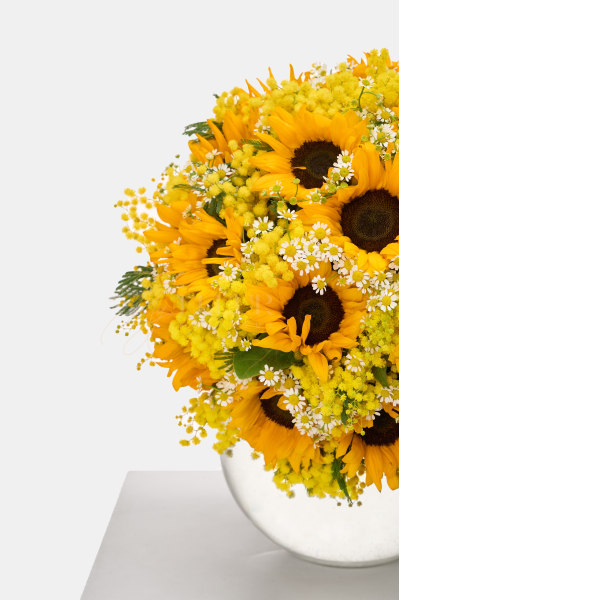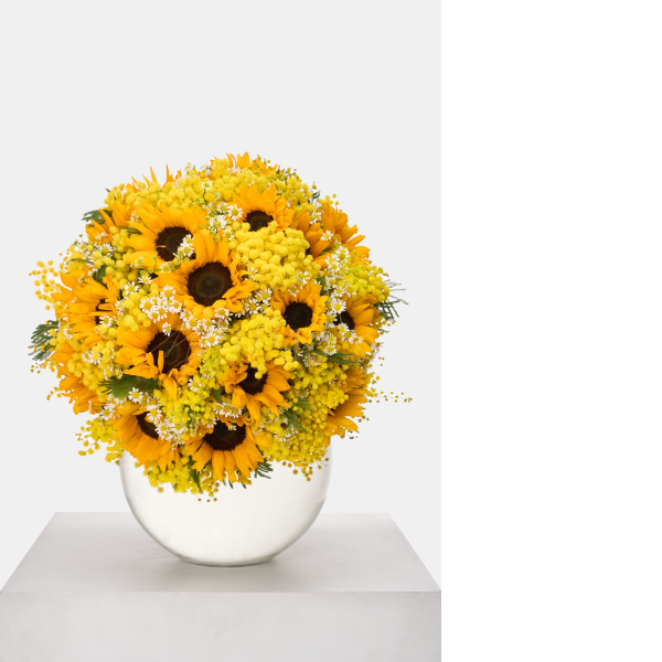 Bask in the vibrant radiance of this brilliant yellow floral arrangement, where lively blooms bring forth a burst of sunshine. Petals of intense gold dance alongside clusters of soft, feathered blossoms, creating a lively composition reminiscent of a sunlit meadow. The arrangement emanates a cheerful glow, capturing the essence of nature's brilliance and warmth. This bright ensemble, with its sun-kissed hues and lively interplay, evokes the energy of a sun-drenched day, bringing joy and vibrancy to any space.